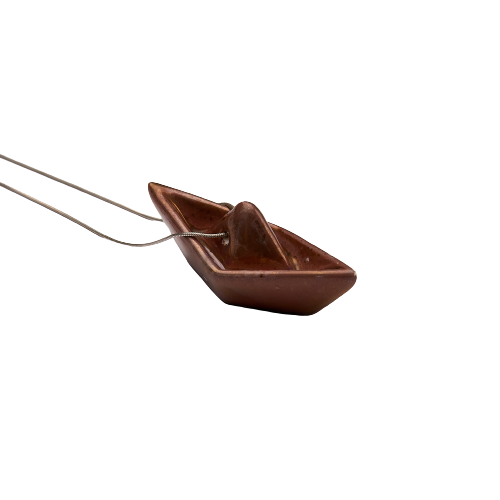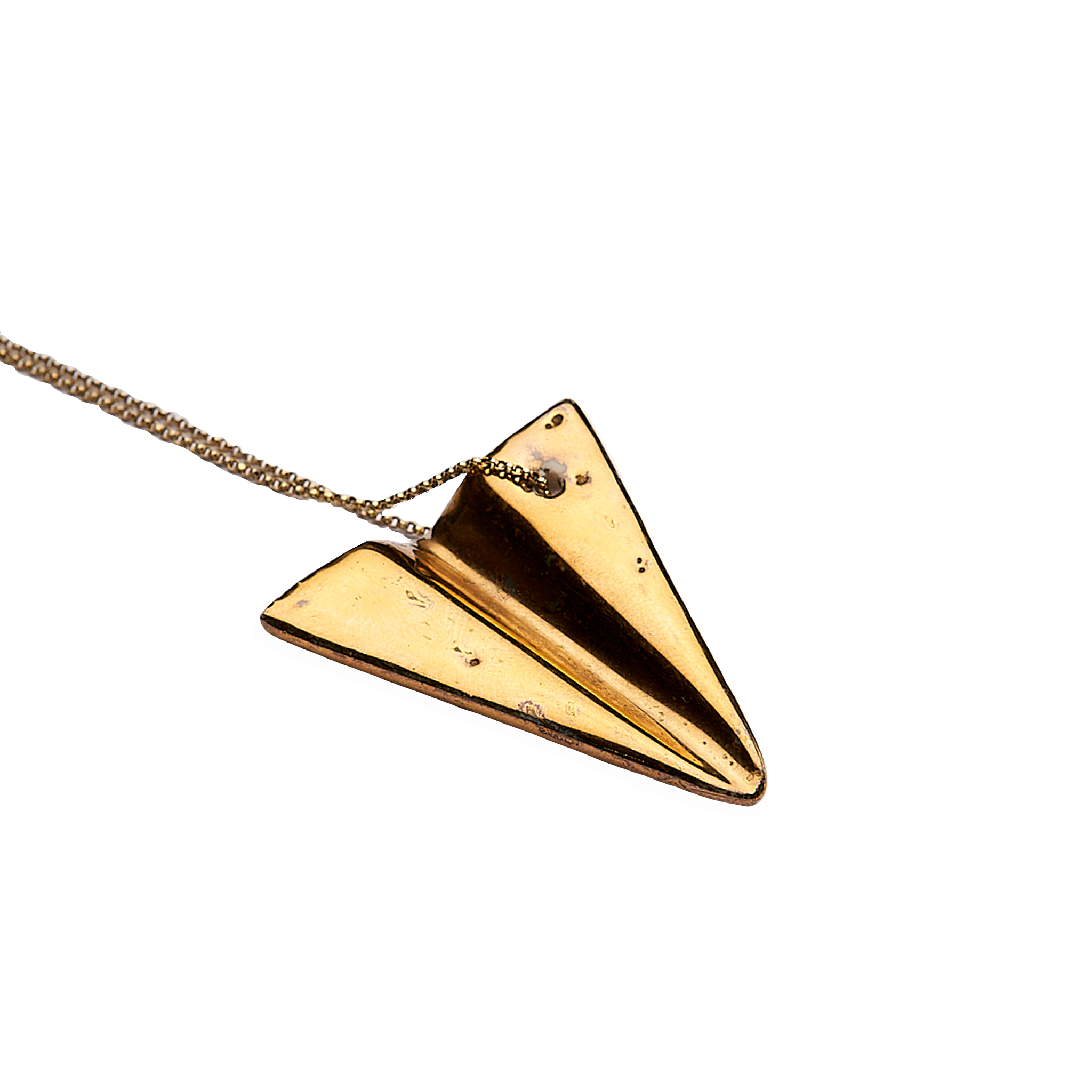 Dije avión de papel hecho en cerámica con esmalte Oro de 14k. Cadena de Plata de 55 cm.