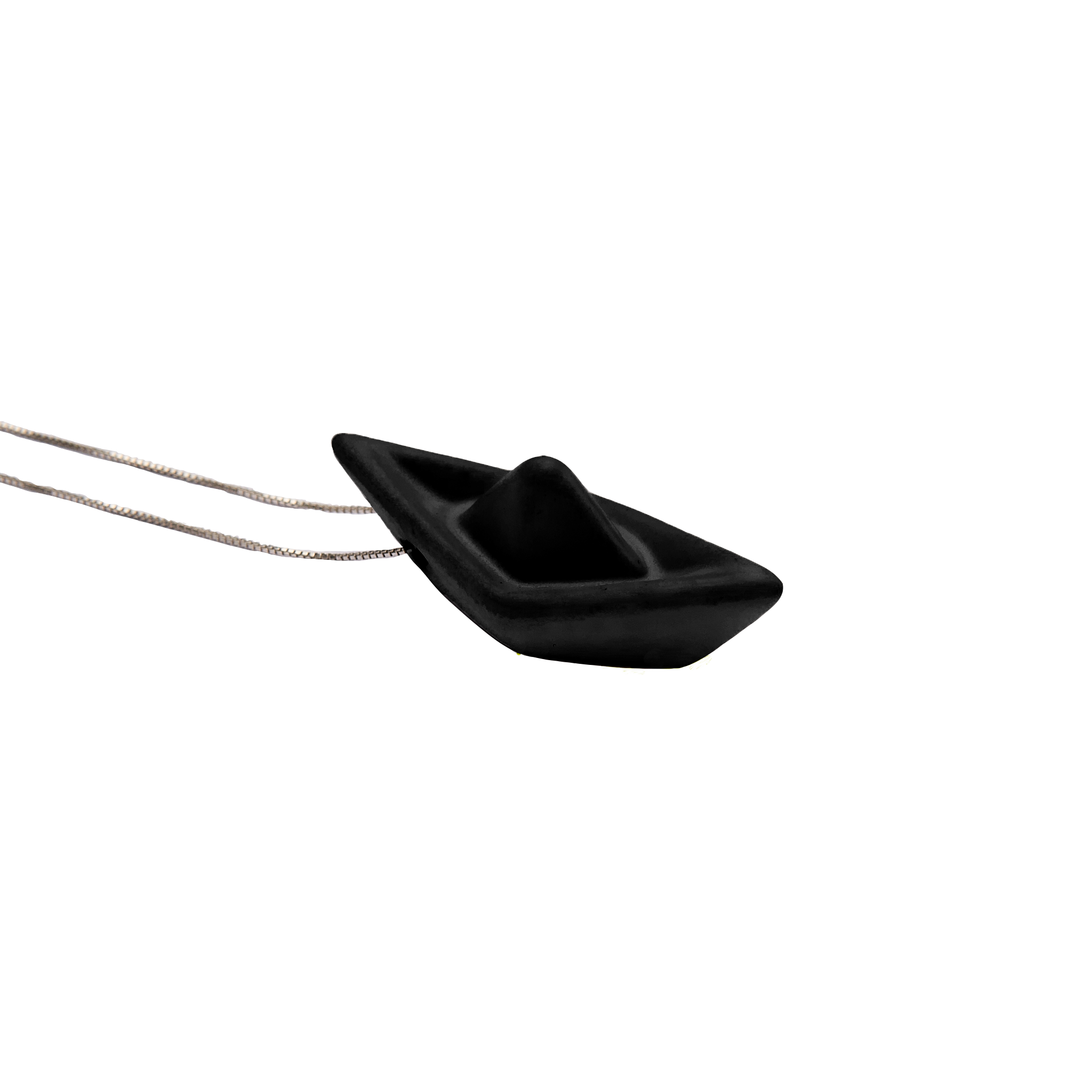 Dije barco de papel hecho en cerámica, negro mate. Cadena de Plata de 55 cm.